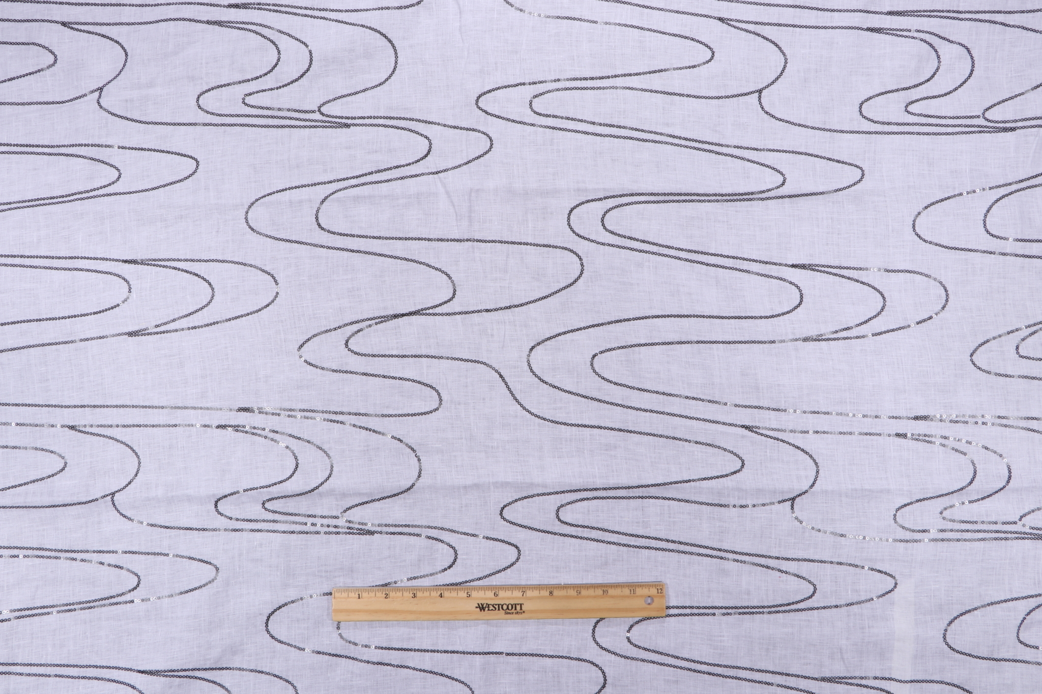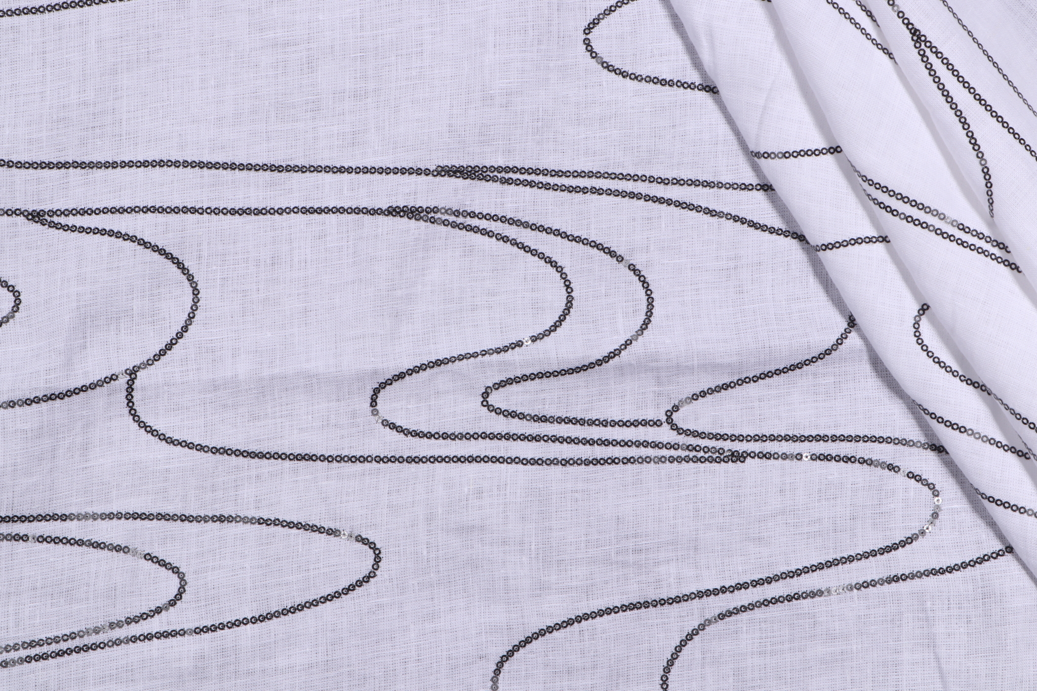 Available now: .88 yards of Surge Sequin, a versatile embroidered drapery fabric for your project. This fabric is suitable for short curtains, decorative tiebacks, or smaller window treatments. Note: If you are unsure about the suitability of this fabric for your specific use case please contact us prior to ordering.