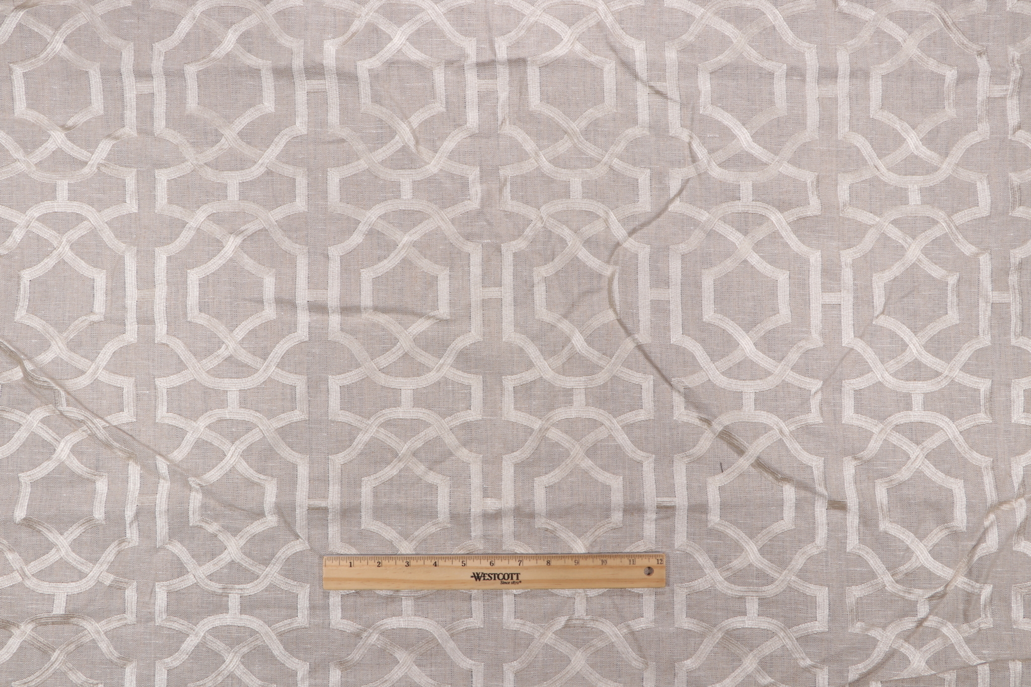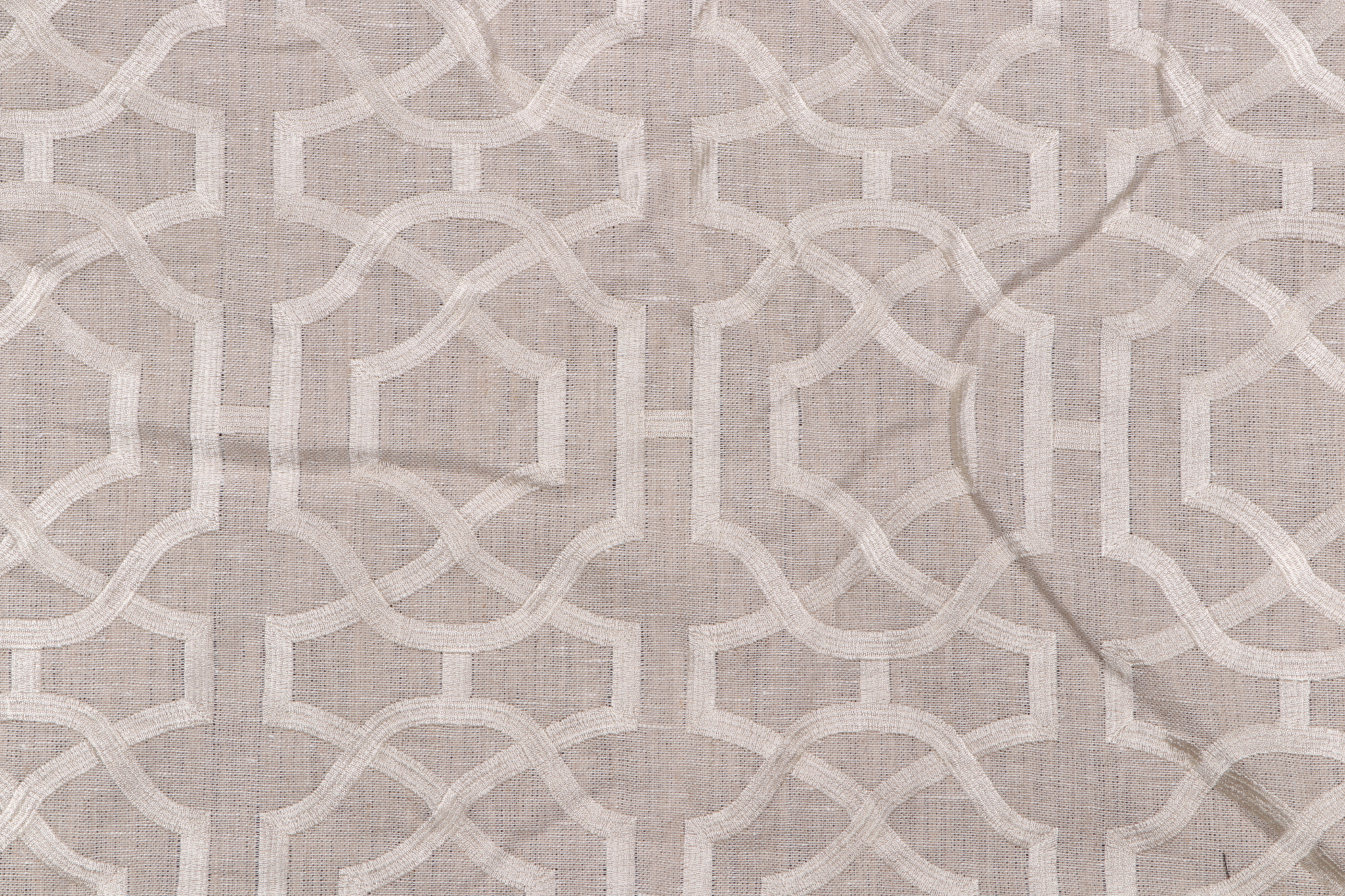 Available now: 1.25 yards of Alston Trellis, a premium embroidered linen drapery fabric by Thibaut. This fabric is suitable for short curtains, decorative tiebacks, or smaller window treatments. Note: If you are unsure about the suitability of this fabric for your specific use case please contact us prior to ordering.