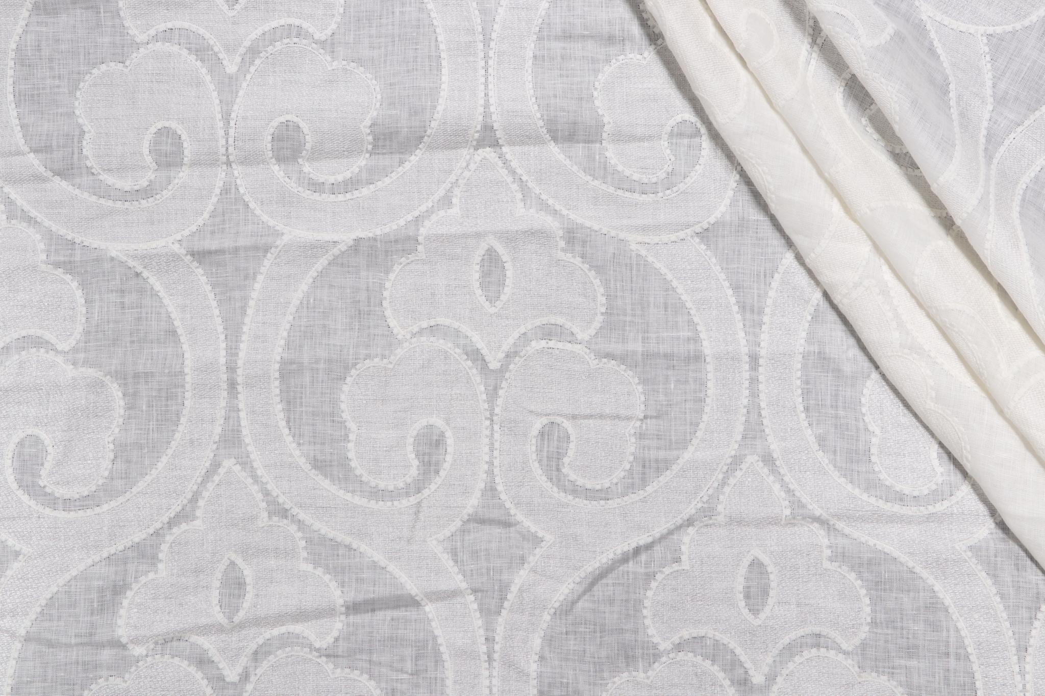 Thibaut Clovis W714263 Sheer Embroidered Linen Drapery Fabric in Off-White is a remnant. Fabric remnants refer to leftover pieces of fabric from production runs at manufacturing sites or pieces that remain from by the yard stock. The lengths of these remnants can vary from a few inches to several yards and are typically sold at a reduced price, since they represent remaining inventory.
