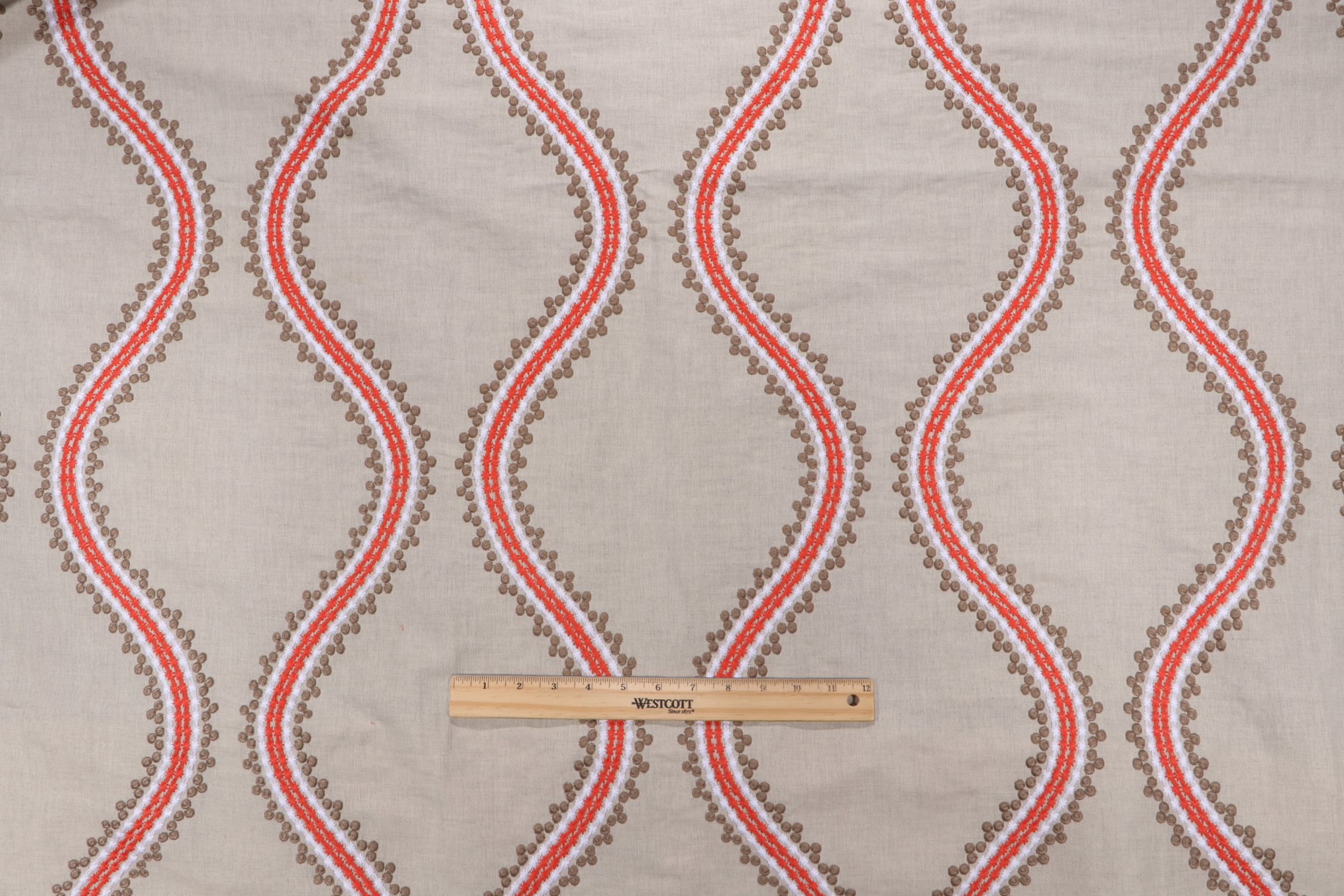 If you order 3.63 Yards Thibaut Juniper Ogee W764106 Embroidered Drapery Fabric in Coral and Stone before 2pm Central with expedited shipping, your order will ship the same business day, otherwise please allow 1-2 business days.How soon will this fabric ship?
