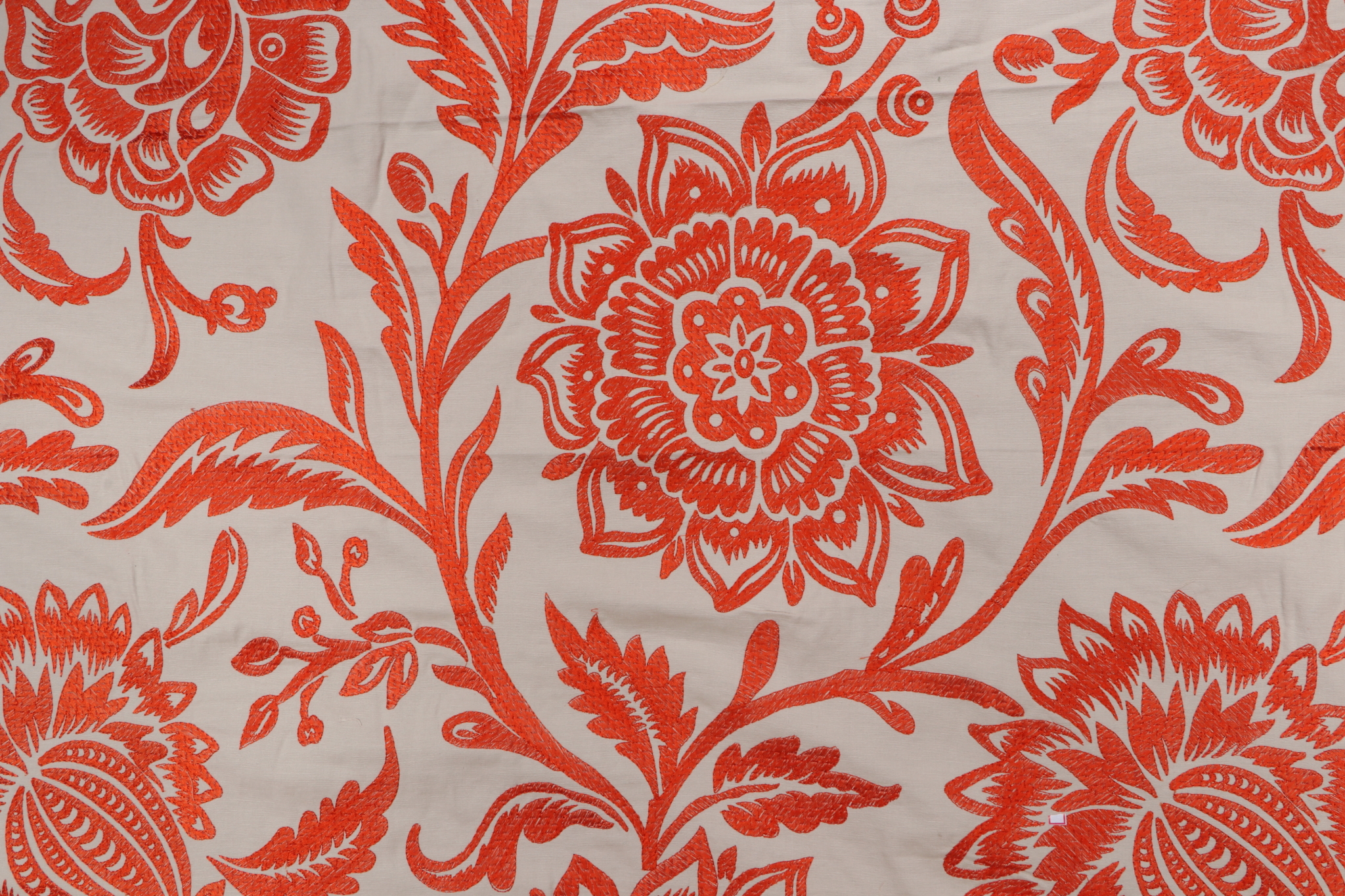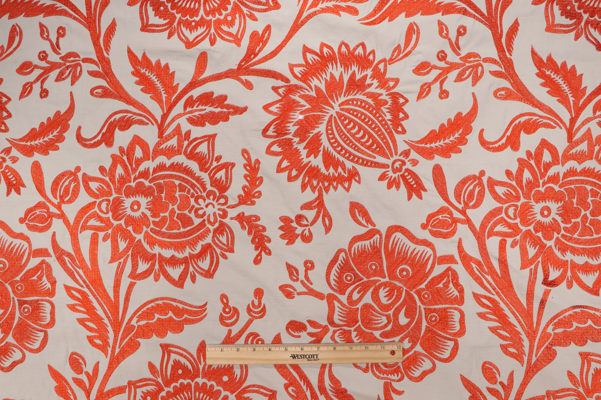 Thibaut Rivera W713047 Embroidered Drapery Fabric in Coral on Flax is a remnant. Fabric remnants refer to leftover pieces of fabric from production runs at manufacturing sites or pieces that remain from by the yard stock. The lengths of these remnants can vary from a few inches to several yards and are typically sold at a reduced price, since they represent remaining inventory.