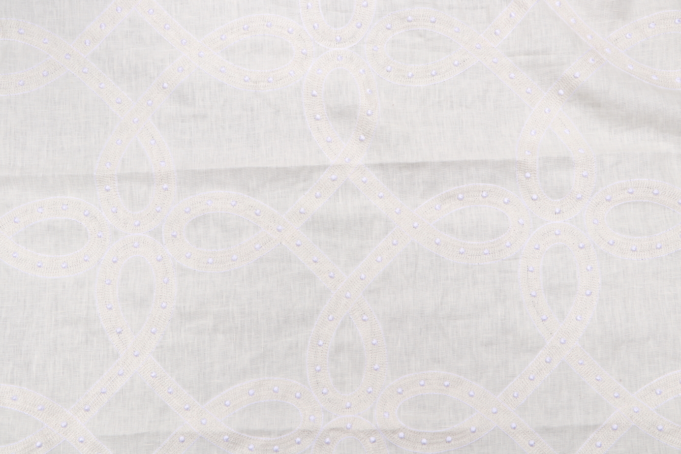 Thibaut Salina Ribbon AW1376 Embroidered Drapery Fabric in White is a remnant. Fabric remnants refer to leftover pieces of fabric from production runs at manufacturing sites or pieces that remain from by the yard stock. The lengths of these remnants can vary from a few inches to several yards and are typically sold at a reduced price, since they represent remaining inventory.