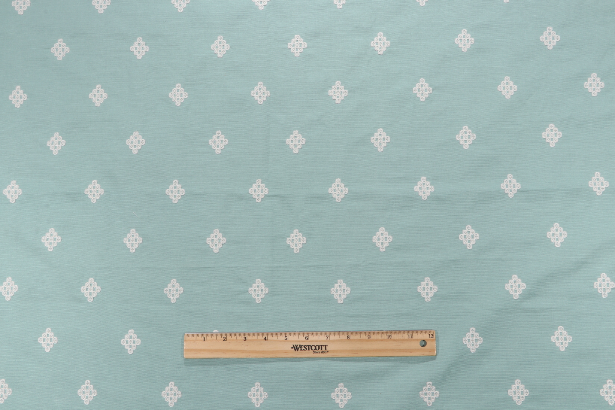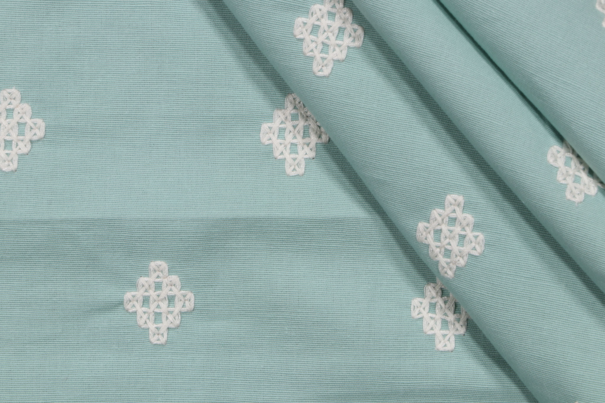 Thibaut Zambia W736119 Embroidered Drapery Fabric in Aqua is a remnant. Fabric remnants refer to leftover pieces of fabric from production runs at manufacturing sites or pieces that remain from by the yard stock. The lengths of these remnants can vary from a few inches to several yards and are typically sold at a reduced price, since they represent remaining inventory.