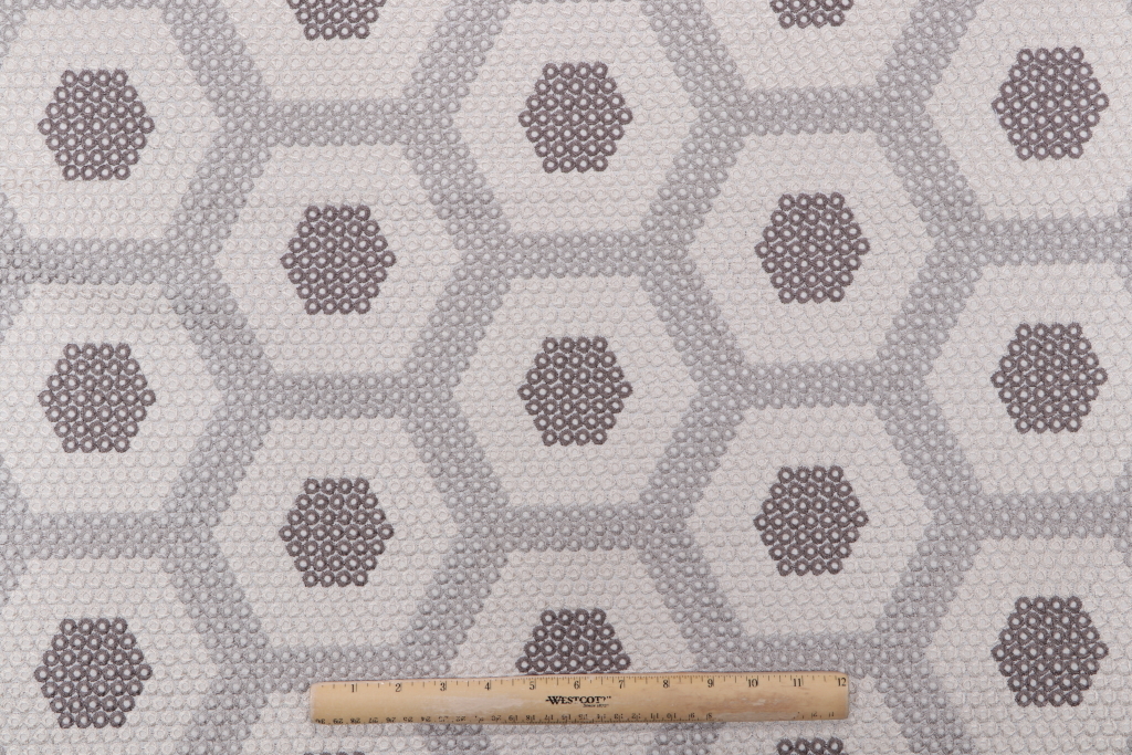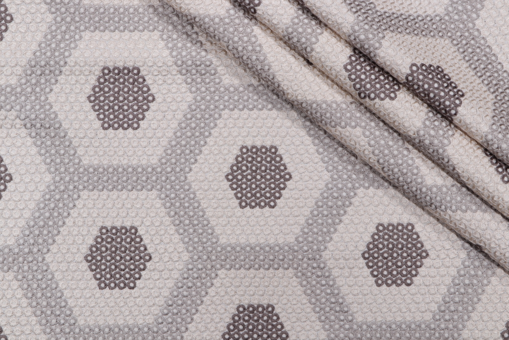 This is 1 yards of Prizm, a high-quality embroidered drapery fabric from Valiant. This fabric is suitable for short curtains, decorative tiebacks, or smaller window treatments. Note: If you are unsure about the suitability of this fabric for your specific use case please contact us prior to ordering.