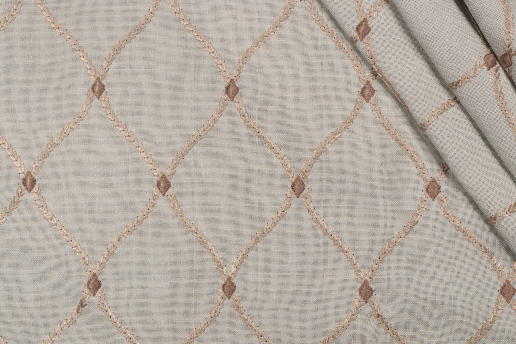Vine Trellis Embroidered Drapery Fabric in Spa is a remnant. Fabric remnants refer to leftover pieces of fabric from production runs at manufacturing sites or pieces that remain from by the yard stock. The lengths of these remnants can vary from a few inches to several yards and are typically sold at a reduced price, since they represent remaining inventory.