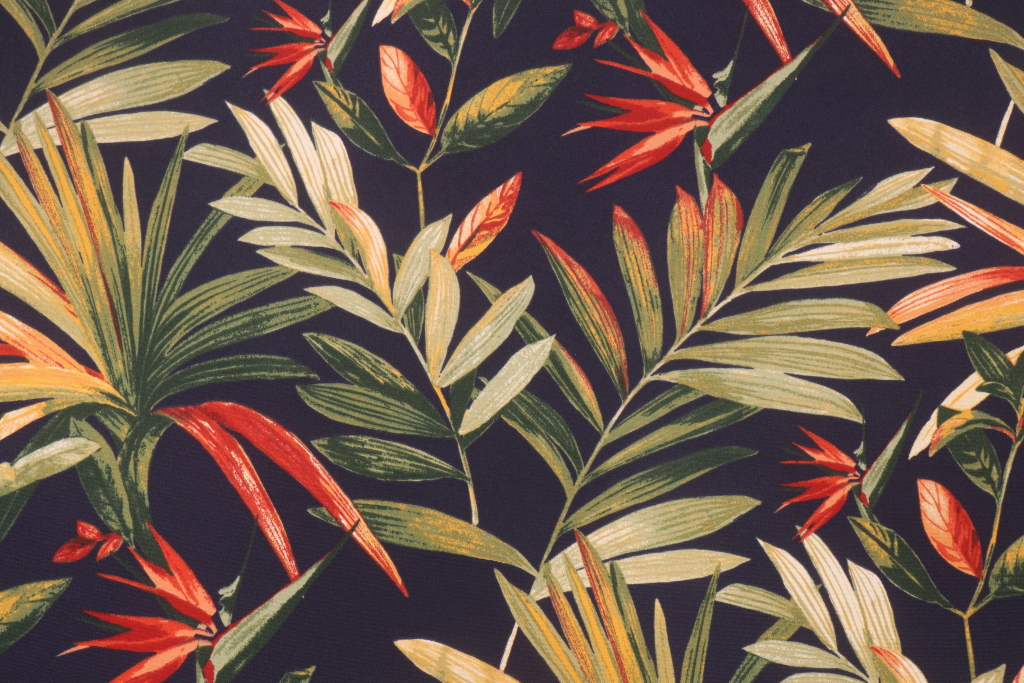 Bryant Fabrics Jungle Tropical Printed Polyester Outdoor Fabric. This printed indoor/outdoor fabric is perfect for any project where the fabric will be exposed to the weather. Uses include cushions, tablecloths, upholstery projects, decorative pillows and craft projects. This fabric has a slightly stiff feel but is easy to work with.