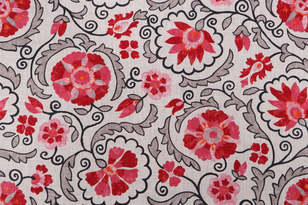 Jaclyn Smith Home JSP078 Printed Linen Blend Drapery Fabric in Redbud is a remnant, which is sold as a whole piece.