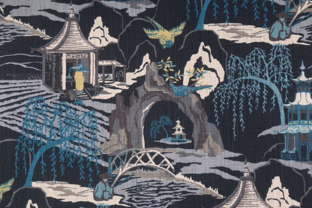 Robert Allen Neo Toile Printed Cotton Drapery Fabric in Midnight. This printed fabric is perfect for window treatments, decorative pillows, handbags, light duty upholstery applications and almost any craft project. This fabric has a soft workable feel yet is stable and durable.