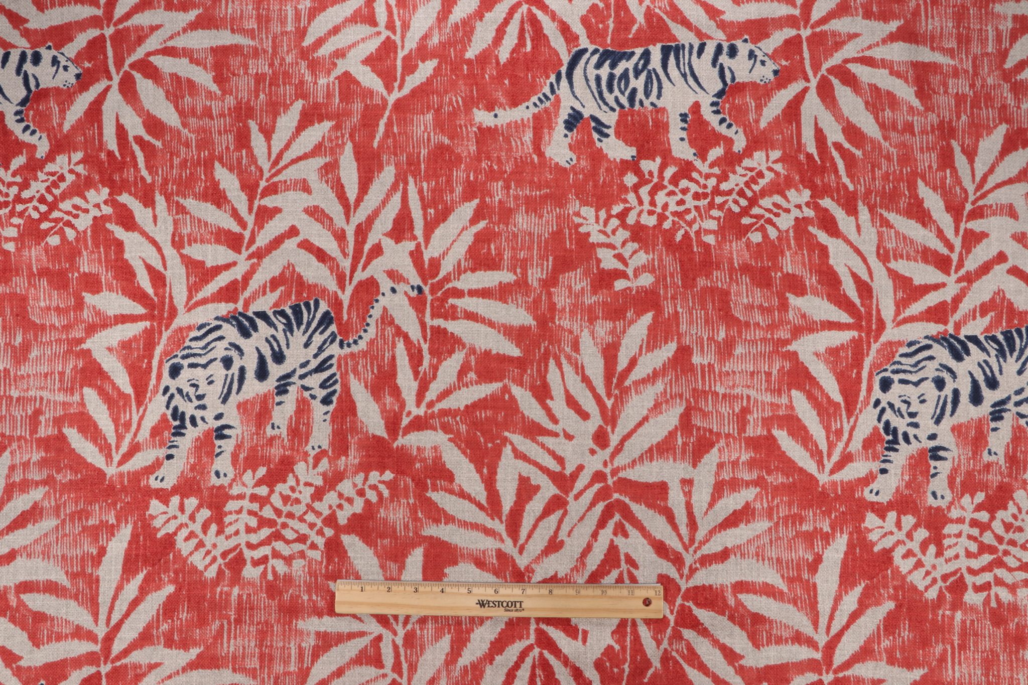 Hilary Farr Le Tigre Printed Cotton Blend Drapery Fabric in 137-Antique Red for Covington is a remnant. Fabric remnants refer to leftover pieces of fabric from production runs at manufacturing sites or pieces that remain from by the yard stock. The lengths of these remnants can vary from a few inches to several yards and are typically sold at a reduced price, since they represent remaining inventory.