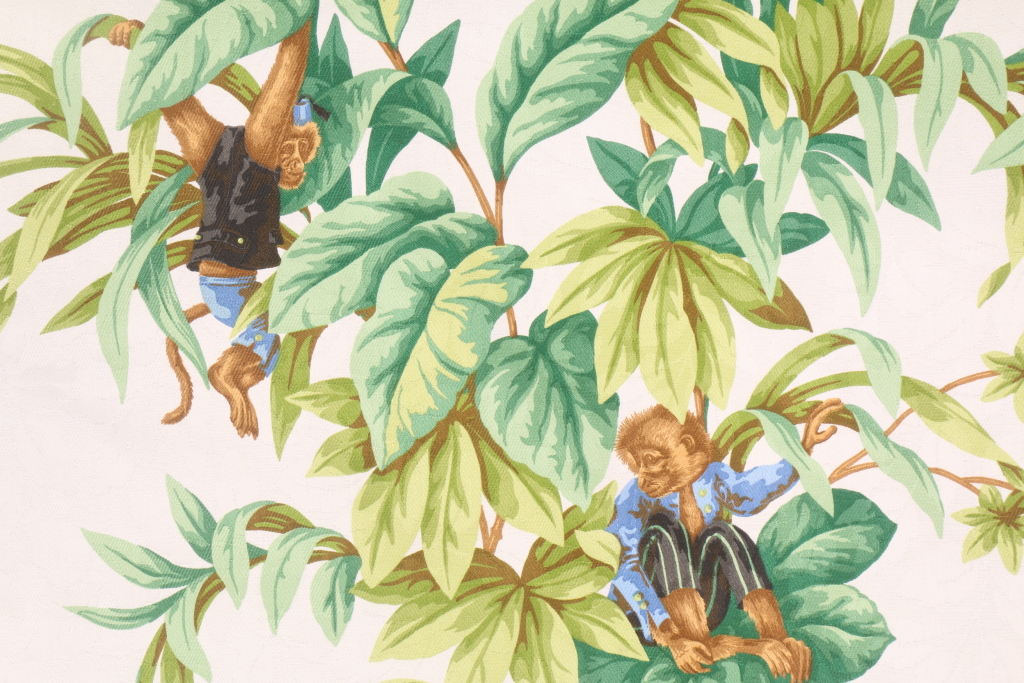 Monkey Jungle Printed Cotton Jacquard Drapery Fabric in White. This printed fabric is perfect for window treatments, decorative pillows, handbags, light duty upholstery applications and almost any craft project. This fabric has a soft workable feel yet is stable and durable.