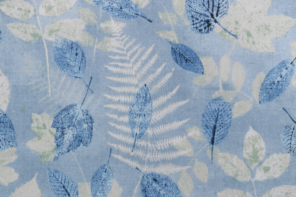 PK Lifestyles Farmhouse Leaf Printed Polyester Outdoor Fabric in Chambray is a remnant, which is sold as a whole piece.
