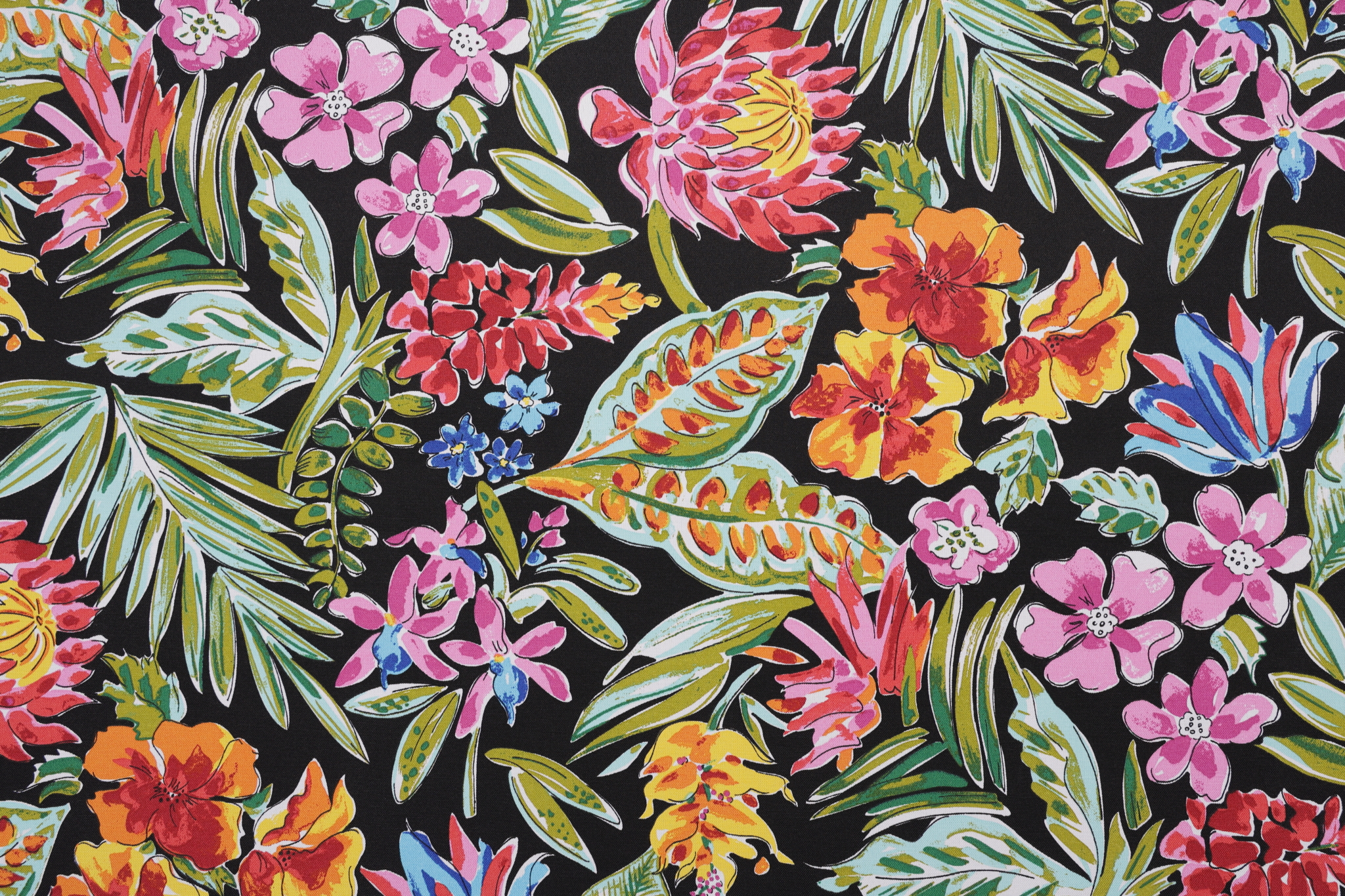 Paradise Island Printed Polyester Outdoor Fabric in Black is a remnant, which is sold as a whole piece.