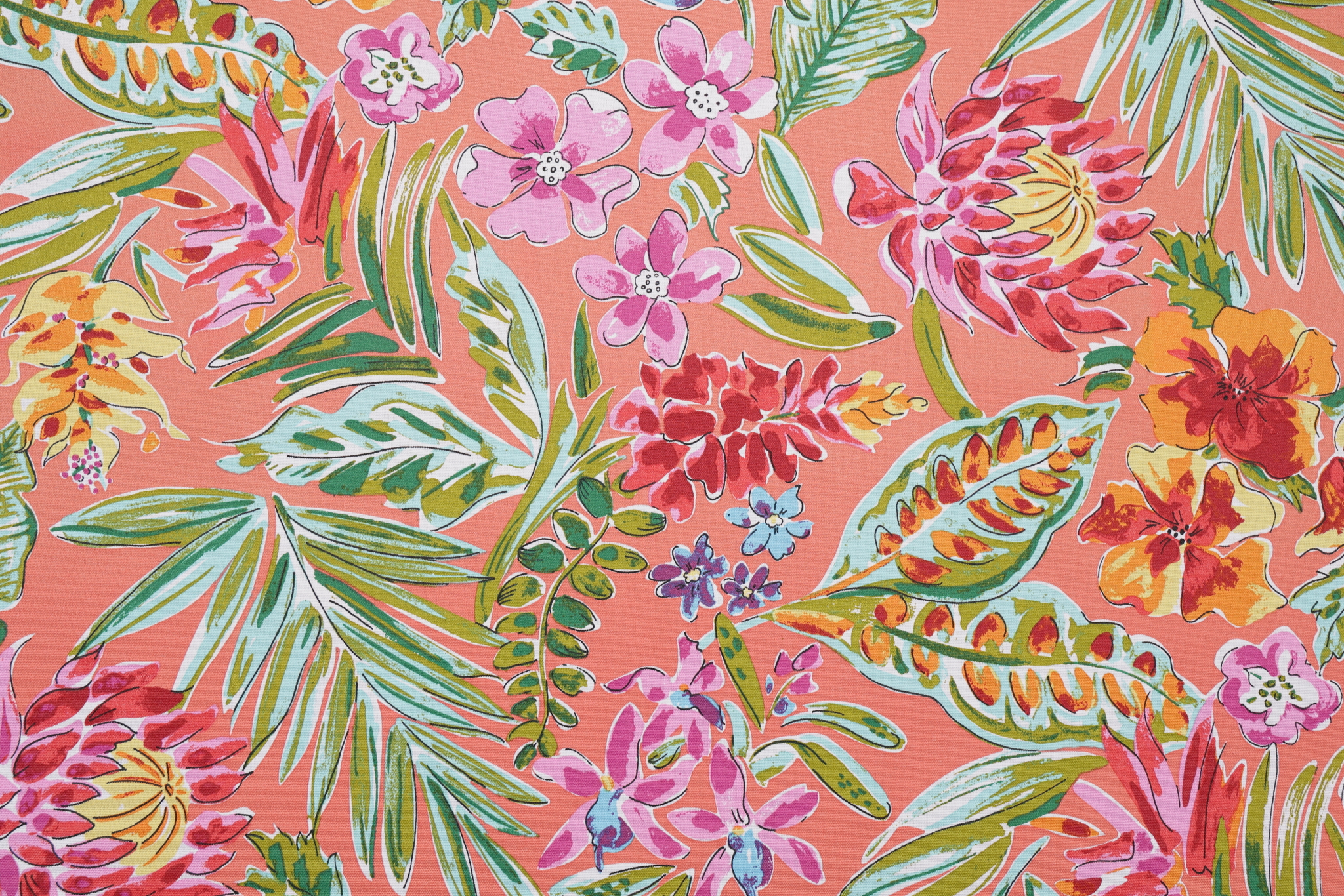 Paradise Island Printed Polyester Outdoor Fabric in Coral is a remnant, which is sold as a whole piece.