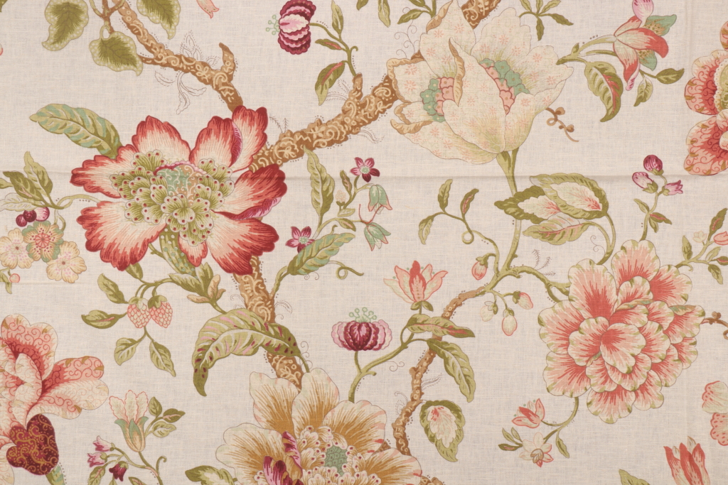 Hamilton Floral Printed Linen Drapery Fabric in Rose is a remnant. Fabric remnants refer to leftover pieces of fabric from production runs at manufacturing sites or pieces that remain from by the yard stock. The lengths of these remnants can vary from a few inches to several yards and are typically sold at a reduced price, since they represent remaining inventory.