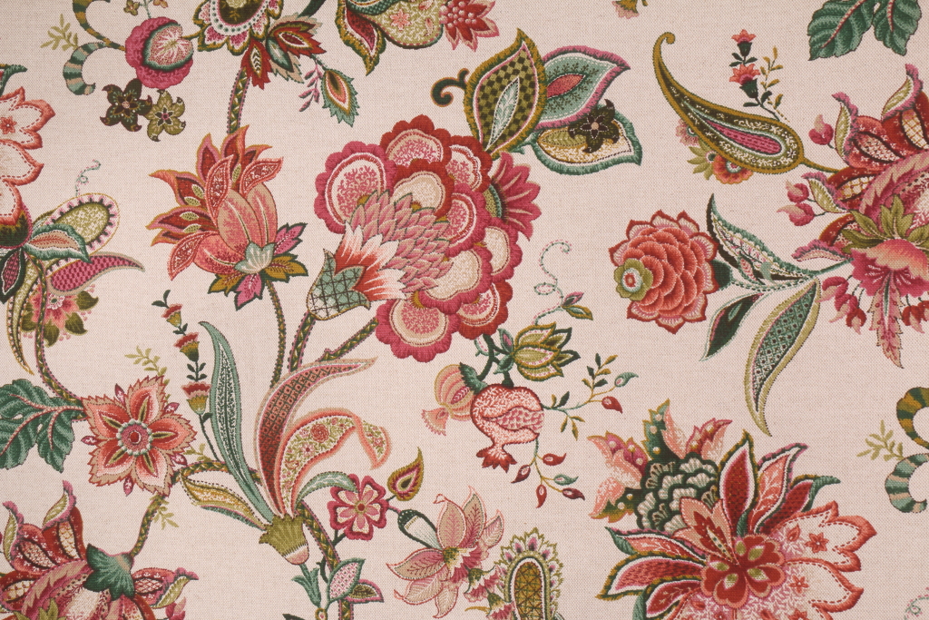 Kaufmann Garden Flora Printed Cotton Linen Drapery Fabric in Geranium. This printed fabric is perfect for window treatments, decorative pillows, handbags, light duty upholstery applications and almost any craft project. This fabric has a soft workable feel yet is stable and durable.