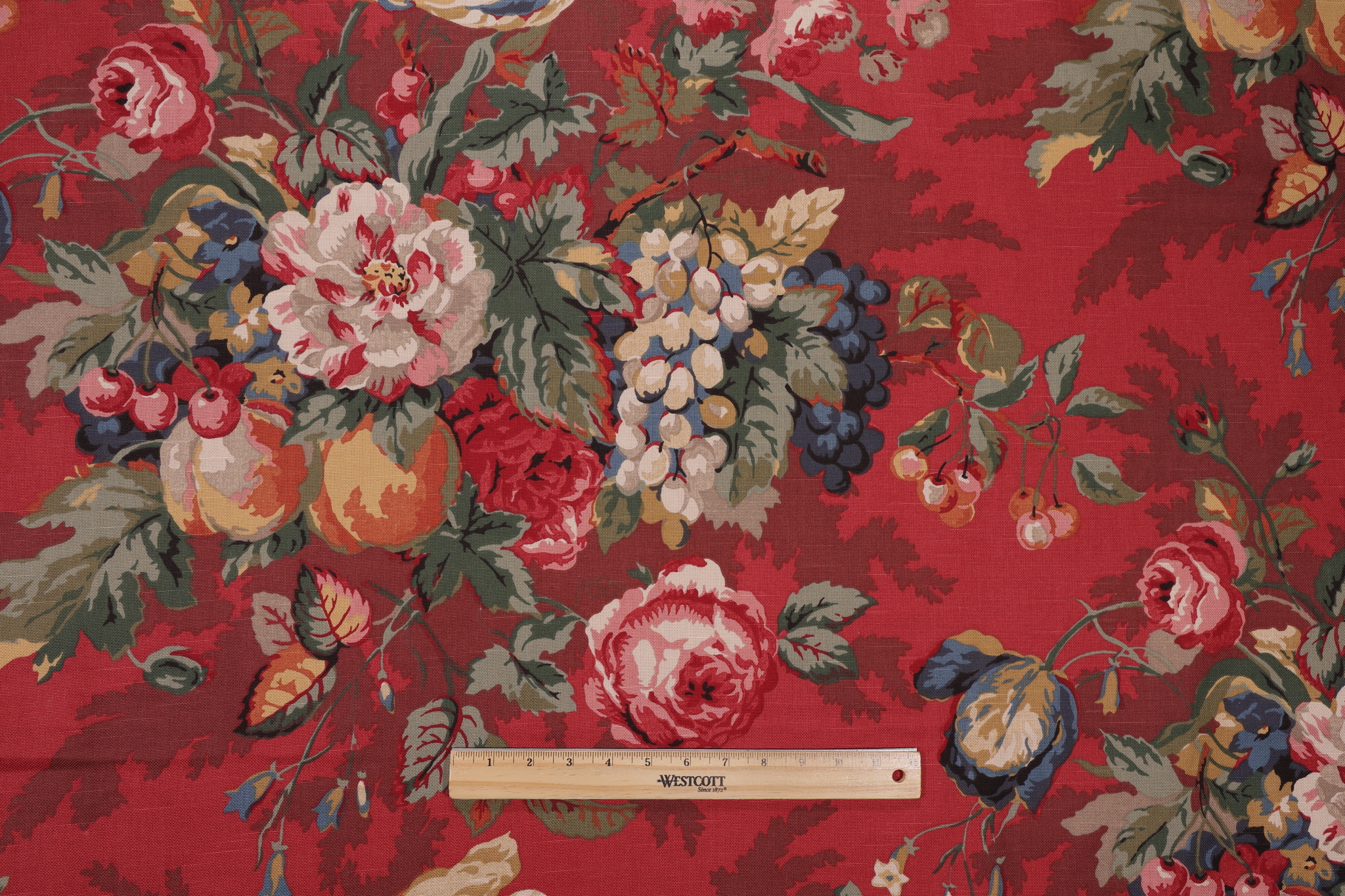 P Kaufmann Queensland Printed Cotton Drapery Fabric in Crimson is a remnant, which is sold as a whole piece.