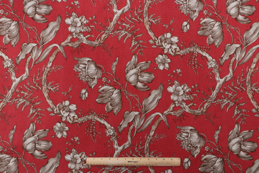 P Kaufmann Tulipano Printed Drapery Fabric in Crimson is a remnant, which is sold as a whole piece.