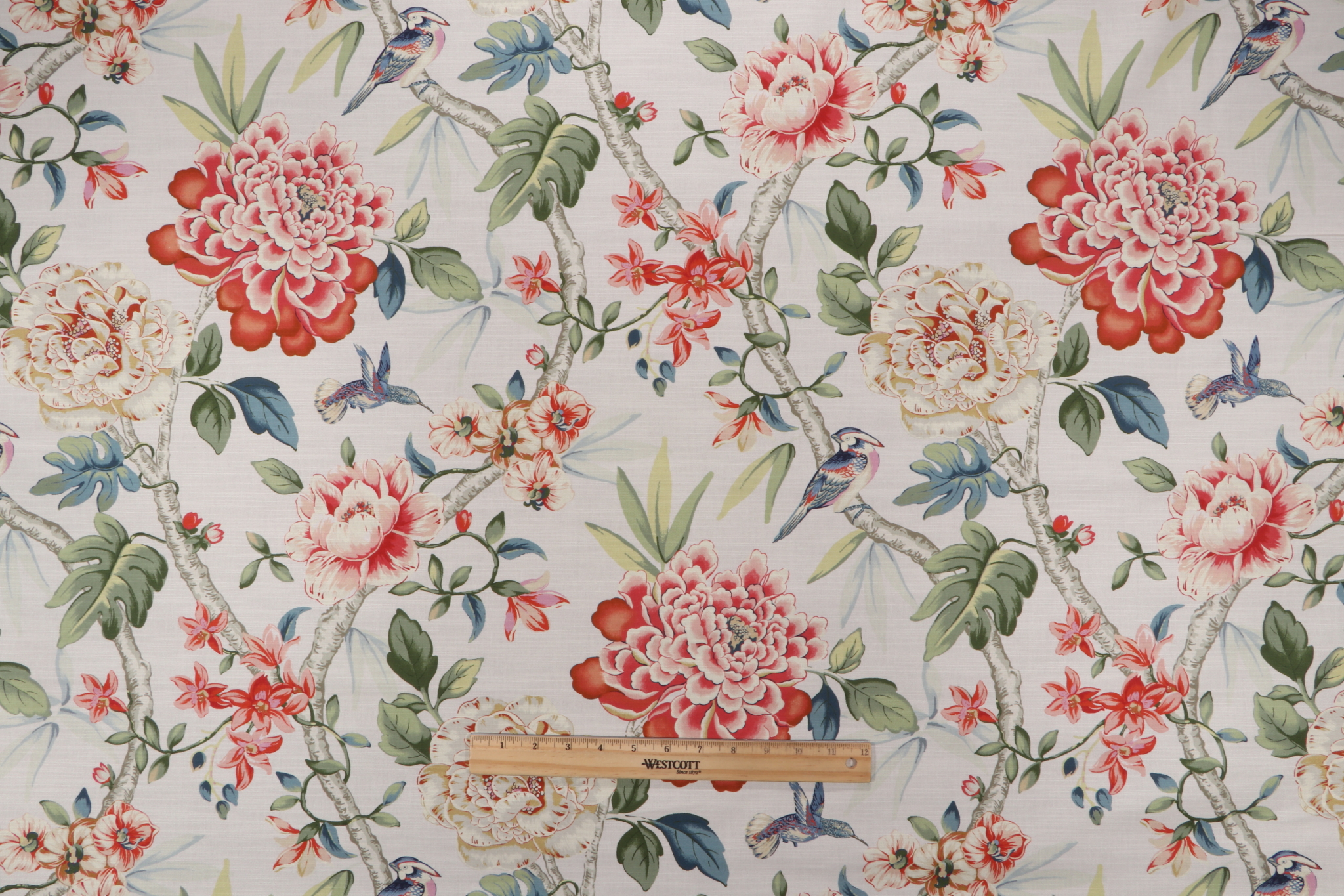If you order a sample of PK Lifestyles Peony Portico Printed Cotton Drapery Fabric in Spring the size of the swatch you receive will be approximately 4" x 6". This is enough fabric to verify color and texture, but may not be large enough to capture an entire pattern.