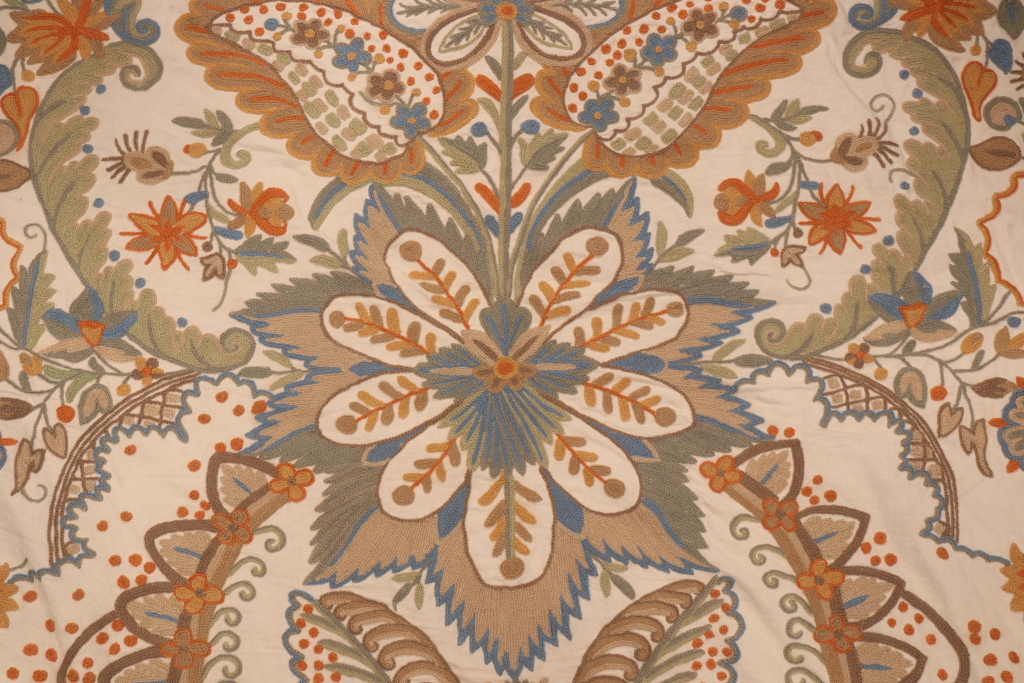 Old World Weavers Lalita Crewel Embroidered Drapery Fabric in Antique is a remnant. Fabric remnants refer to leftover pieces of fabric from production runs at manufacturing sites or pieces that remain from by the yard stock. The lengths of these remnants can vary from a few inches to several yards and are typically sold at a reduced price, since they represent remaining inventory.