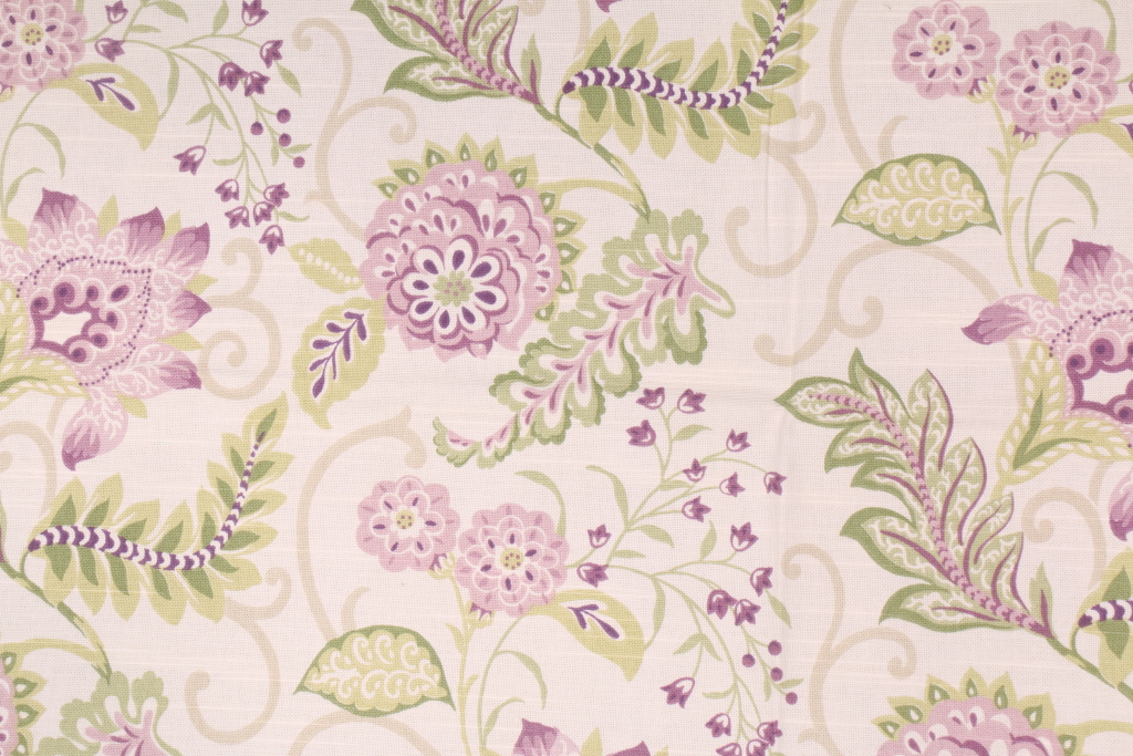 2.1 Yards Richloom Floral Printed Cotton Drapery Fabric in Amethyst. This printed fabric is perfect for window treatments, decorative pillows, handbags, light duty upholstery applications and almost any craft project. This fabric has a soft workable feel yet is stable and durable.