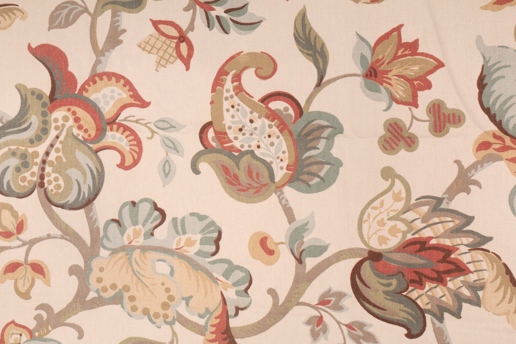 7.2 Yards Richloom Floral Printed Cotton Drapery Fabric in Beige. This printed fabric is perfect for window treatments, decorative pillows, handbags, light duty upholstery applications and almost any craft project. This fabric has a soft workable feel yet is stable and durable.