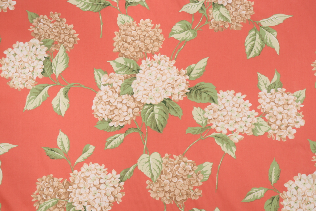 4 Yards Thibaut Hydrangea F93909 Printed Cotton Drapery Fabric in Coral. This printed fabric is perfect for window treatments, decorative pillows, handbags, light duty upholstery applications and almost any craft project. This fabric has a soft workable feel yet is stable and durable.