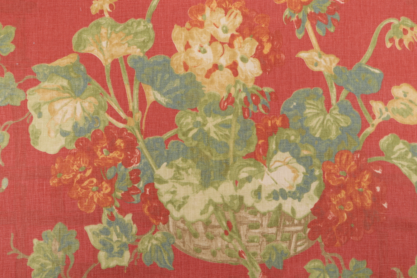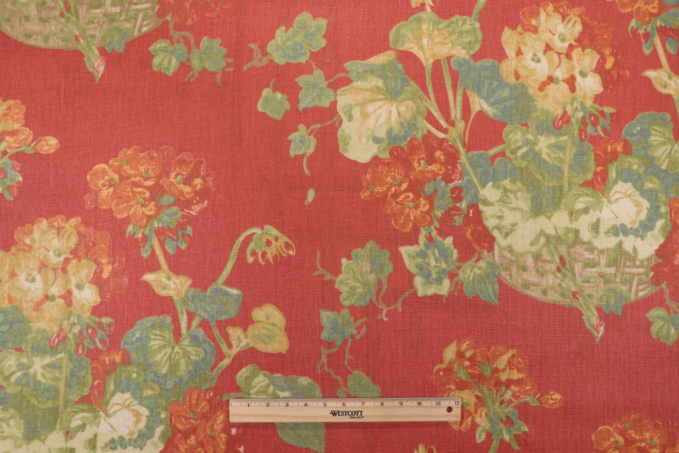 Thibaut Washington F96019 Printed Linen Drapery Fabric in Red is a remnant. Fabric remnants refer to leftover pieces of fabric from production runs at manufacturing sites or pieces that remain from by the yard stock. The lengths of these remnants can vary from a few inches to several yards and are typically sold at a reduced price, since they represent remaining inventory.