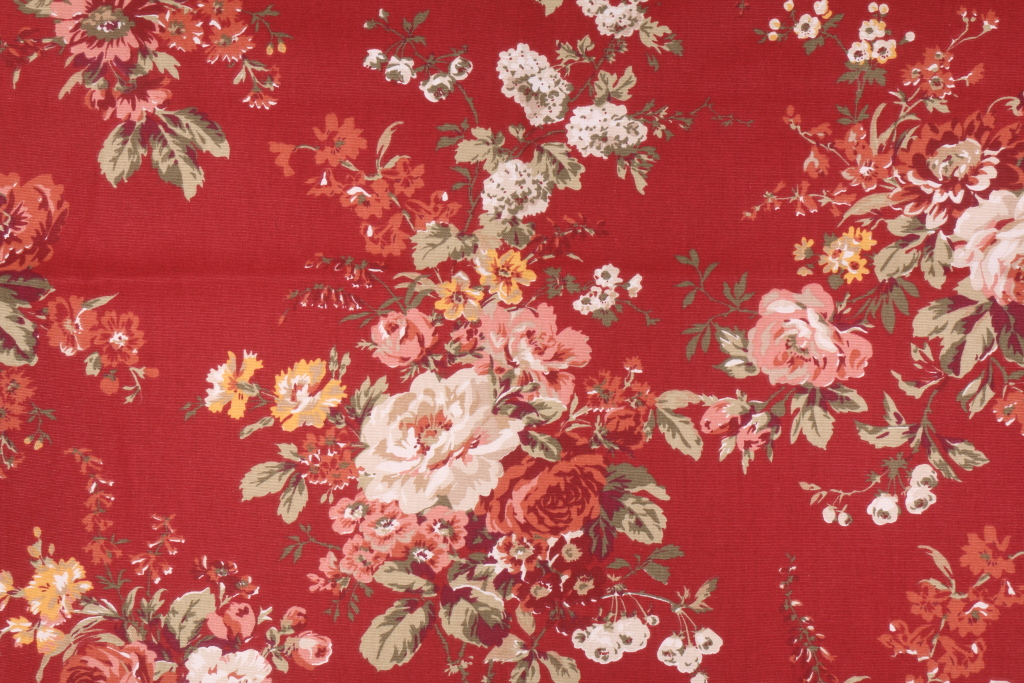 1.5 Yards Waverly Rose Floral Printed Cotton Drapery Fabric in Red. This printed fabric is perfect for window treatments, decorative pillows, handbags, light duty upholstery applications and almost any craft project. This fabric has a soft workable feel yet is stable and durable.