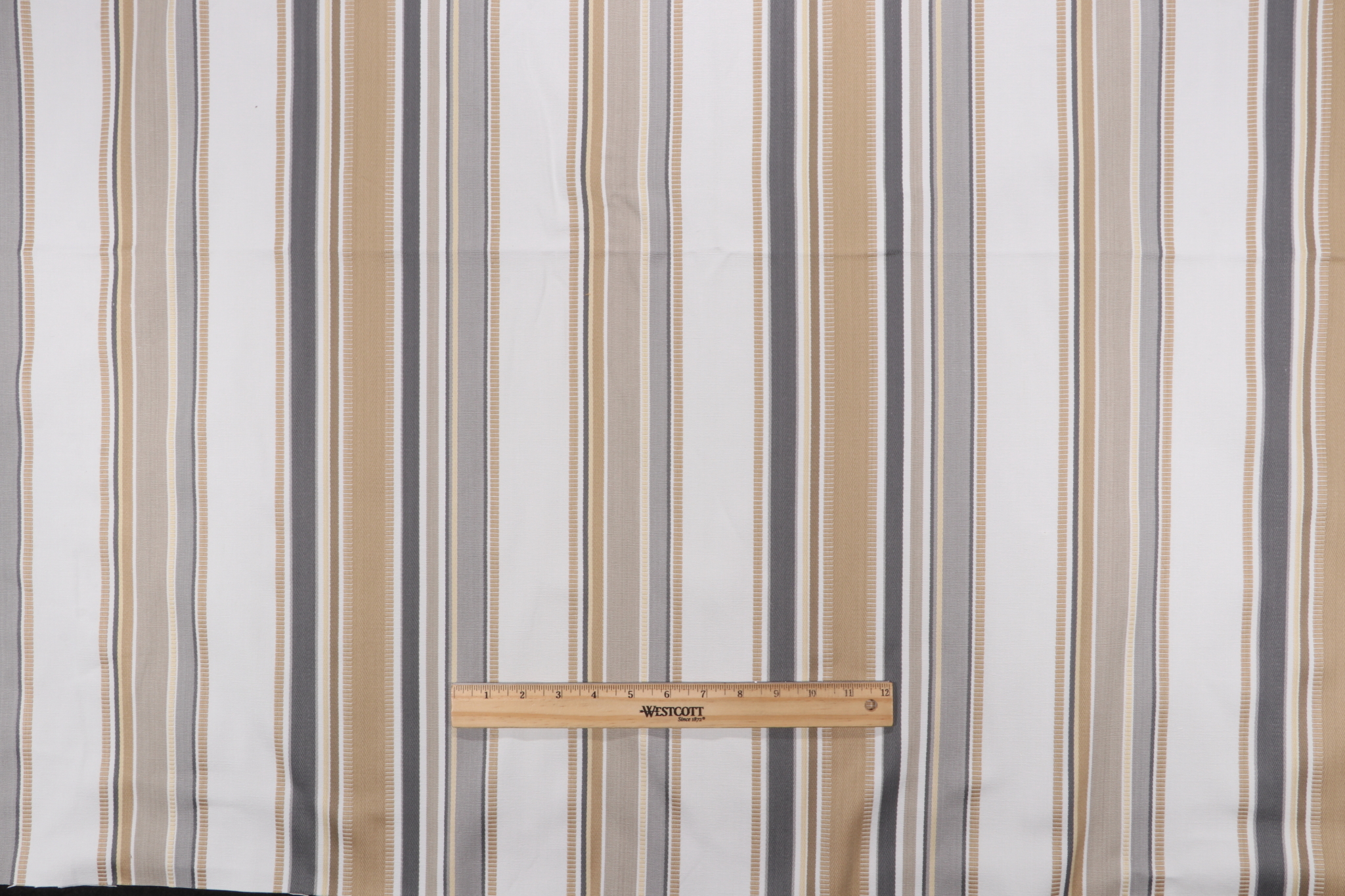 Thibaut Barnegat Stripe W80102 Woven Cotton Decorator Fabric in Platinum and Gold is a remnant. Fabric remnants refer to leftover pieces of fabric from production runs at manufacturing sites or pieces that remain from by the yard stock. The lengths of these remnants can vary from a few inches to several yards and are typically sold at a reduced price, since they represent remaining inventory.