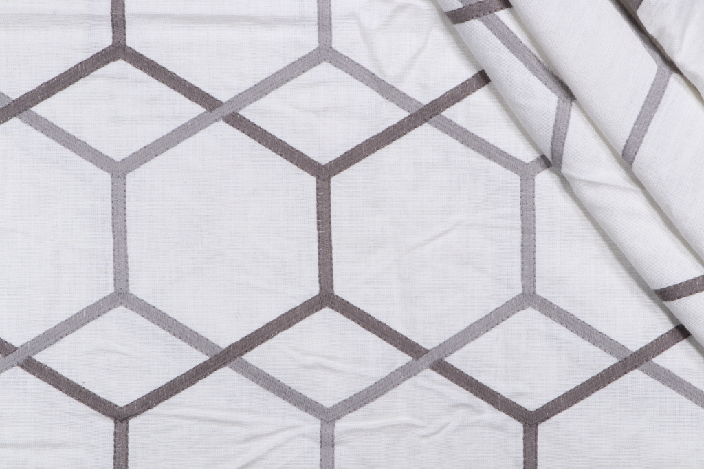 Hex Fret Embroidered Drapery Fabric in Granite is a remnant, which is sold as a whole piece.