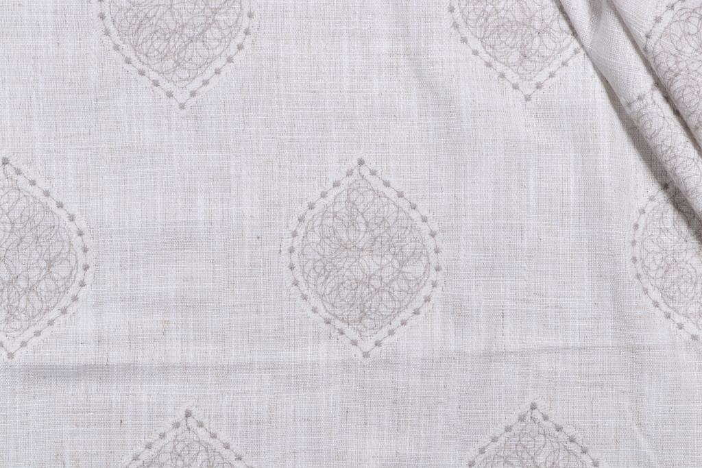 Mini Medallion Embroidered Drapery Fabric in Grey is a remnant. Fabric remnants refer to leftover pieces of fabric from production runs at manufacturing sites or pieces that remain from by the yard stock. The lengths of these remnants can vary from a few inches to several yards and are typically sold at a reduced price, since they represent remaining inventory.