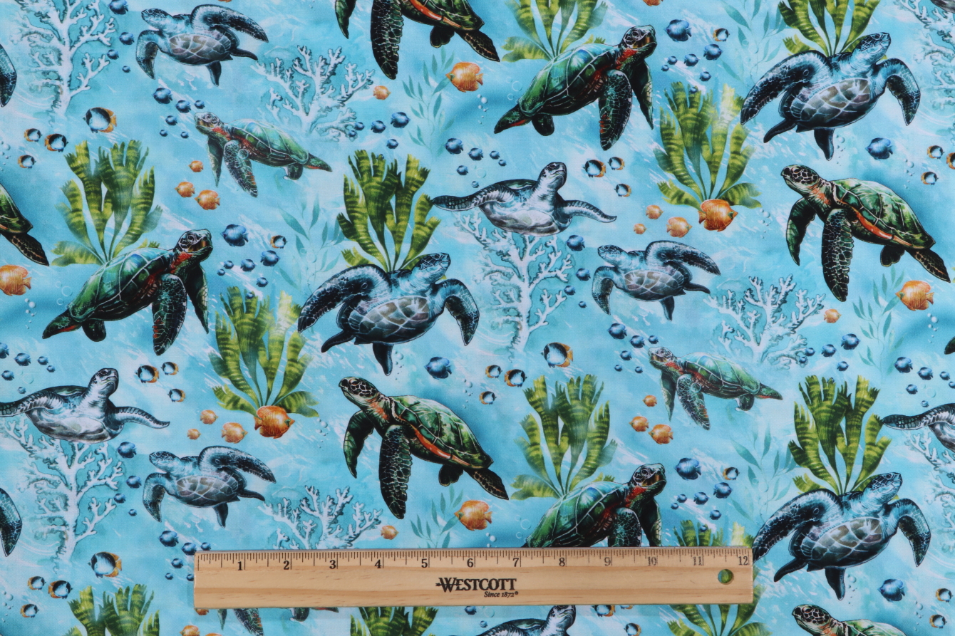 2.5 Yards Timeless Treasures Ocean Life - Sea Turtle Printed Cotton Craft Fabric in Aqua Details