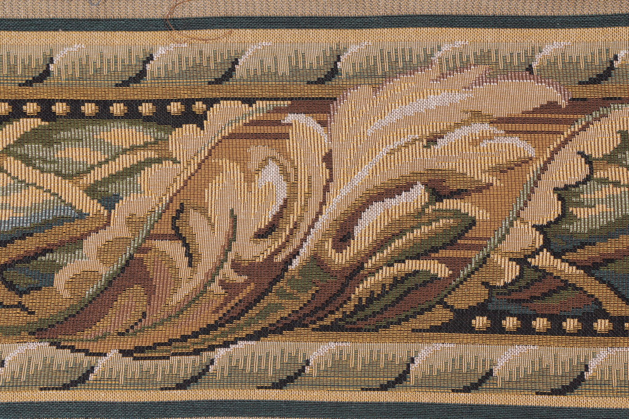 Scalamandre Vietri II 9'' Border Tapestry Border Fabric in Green/Brown is a remnant. Fabric remnants refer to leftover pieces of fabric from production runs at manufacturing sites or pieces that remain from by the yard stock. The lengths of these remnants can vary from a few inches to several yards and are typically sold at a reduced price, since they represent remaining inventory.