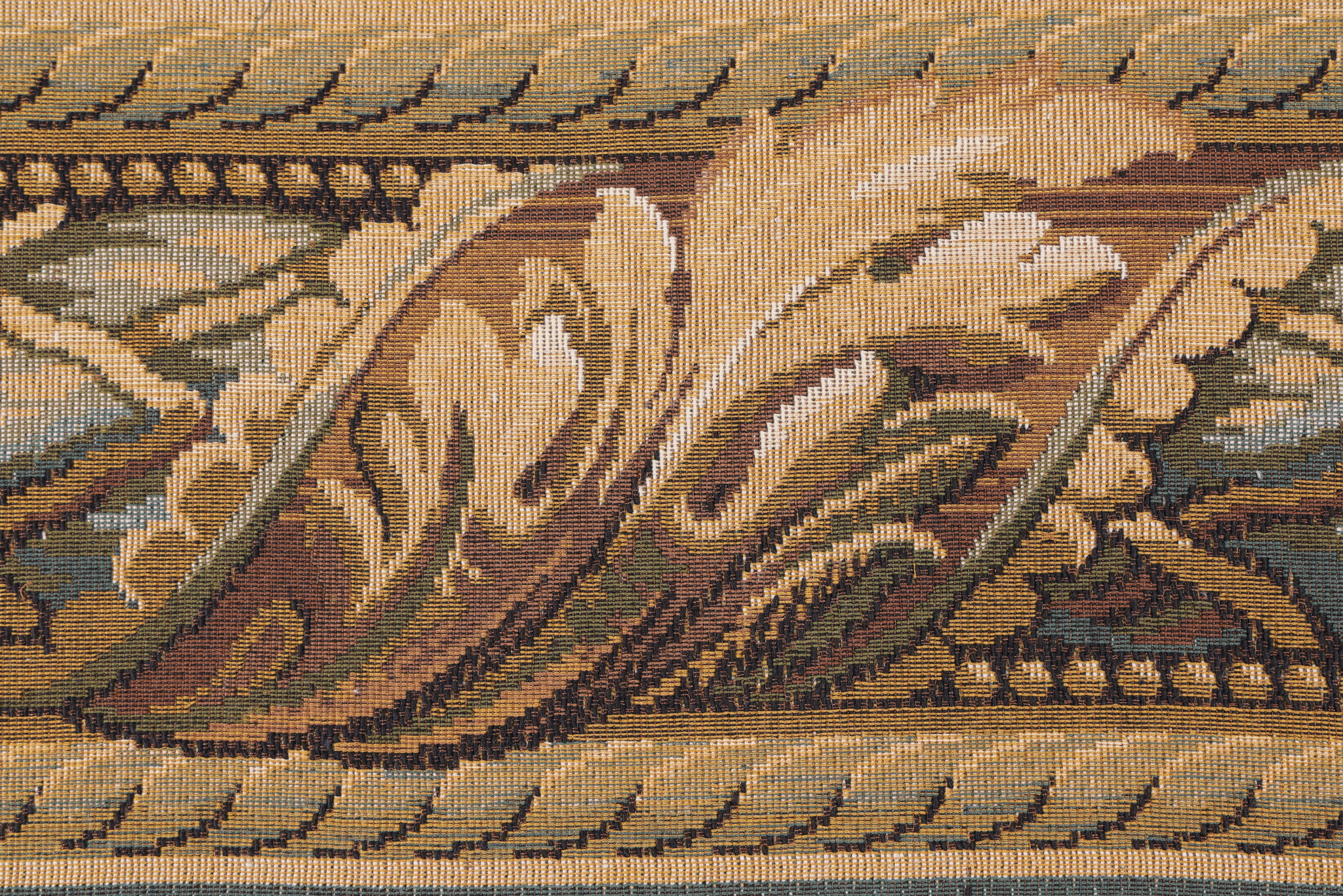 Scalamandre Vietri 9'' Border Tapestry Border Fabric in Green/Brown is a remnant. Fabric remnants refer to leftover pieces of fabric from production runs at manufacturing sites or pieces that remain from by the yard stock. The lengths of these remnants can vary from a few inches to several yards and are typically sold at a reduced price, since they represent remaining inventory.