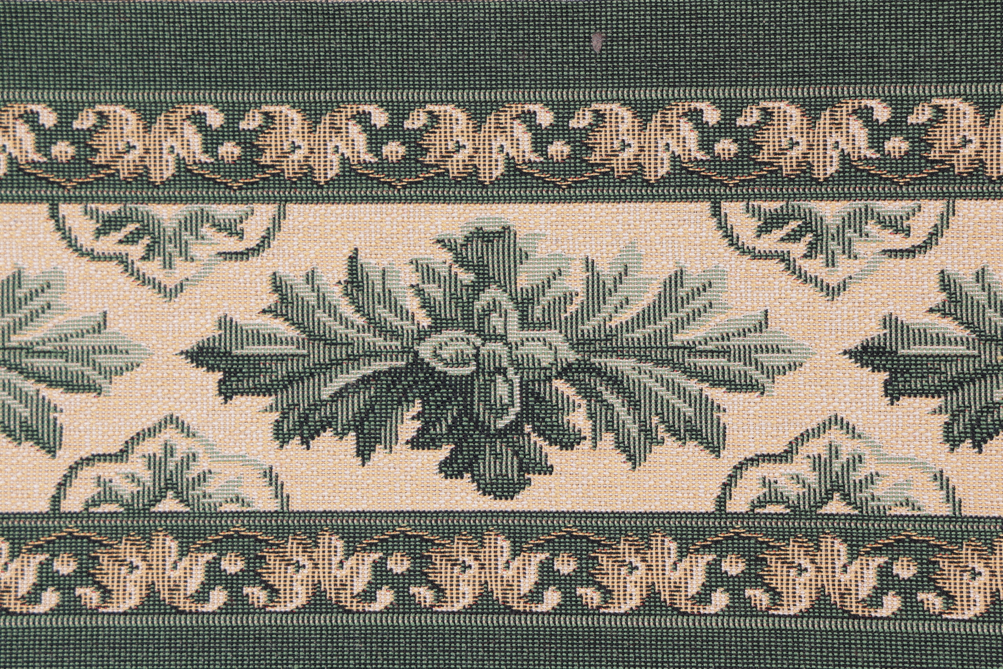 Scalamandre Madrid 6'' Border Tapestry Border Fabric in Green is a remnant. Fabric remnants refer to leftover pieces of fabric from production runs at manufacturing sites or pieces that remain from by the yard stock. The lengths of these remnants can vary from a few inches to several yards and are typically sold at a reduced price, since they represent remaining inventory.