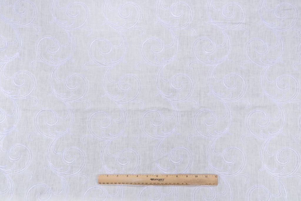 Scrollwork Embroidered Drapery Fabric in Ice is a remnant, which is sold as a whole piece.