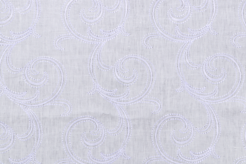 1.38 yards of Scrollwork embroidered drapery fabric is ready for your next creative endeavor. This fabric is suitable for short curtains, decorative tiebacks, or smaller window treatments. Note: If you are unsure about the suitability of this fabric for your specific use case please contact us prior to ordering.