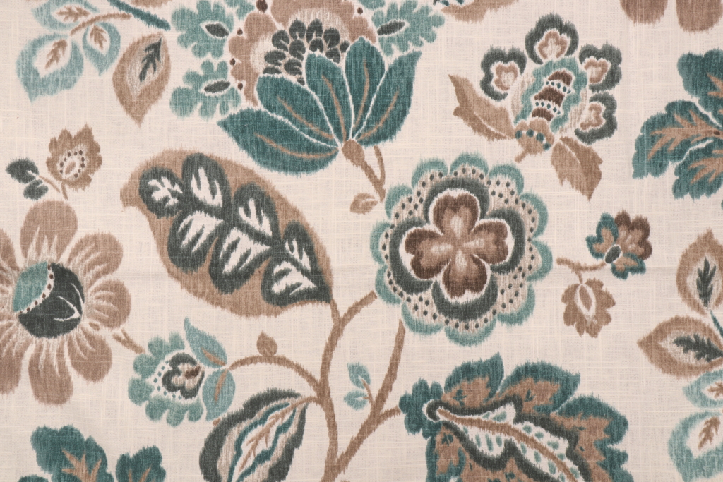 1 Yard Designer Ikat Floral Printed Linen Drapery Fabric in Teal. This printed fabric is perfect for window treatments, decorative pillows, handbags, light duty upholstery applications and almost any craft project. This fabric has a soft workable feel yet is stable and durable.