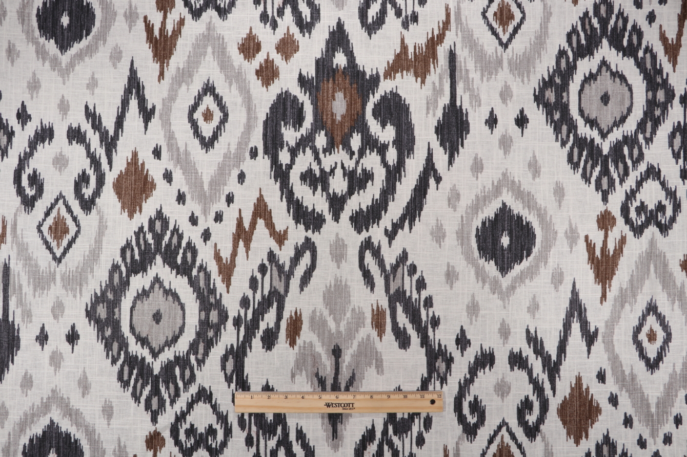 Fabricut Vern Yip Ikat Printed Linen Blend Drapery Fabric in Black is a remnant, which is sold as a whole piece.
