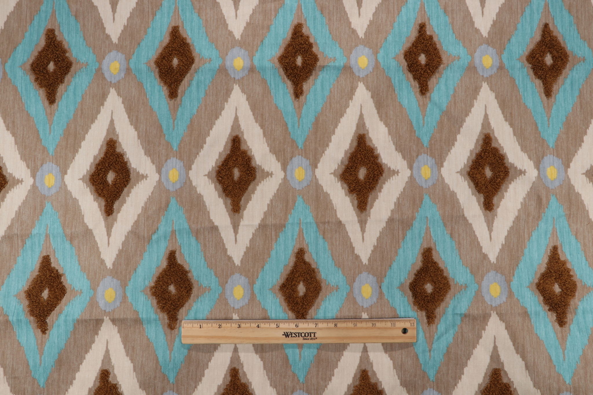 1.5 yards of Modern ikat printed & embroidered drapery fabric, crafted by Robert Allen, is available here. This fabric is suitable for short curtains, decorative tiebacks, or smaller window treatments. Note: If you are unsure about the suitability of this fabric for your specific use case please contact us prior to ordering.