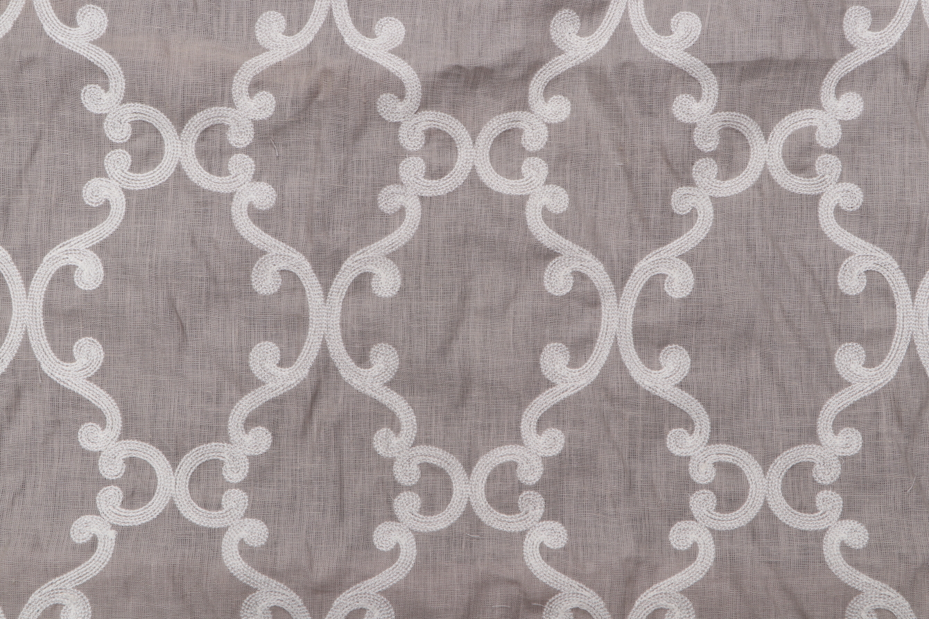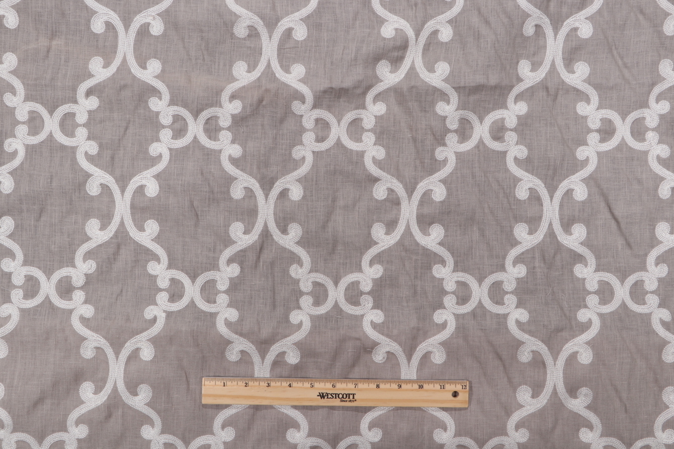 Available now: 3 yards of Roselli Trellis, a premium sheer embroidered drapery fabric by Thibaut. Thibaut fabrics blend classic and modern aesthetics, with a reputation for sophisticated prints and rich textures that elevate any interior design scheme. This fabric is suitable for short curtains, decorative tiebacks, or smaller window treatments. Gray, silver, rosy brown, dark gray, and gainsboro feature prominently in this fabric. Note: If you are unsure about the suitability of this fabric for your specific use case please contact us prior to ordering.