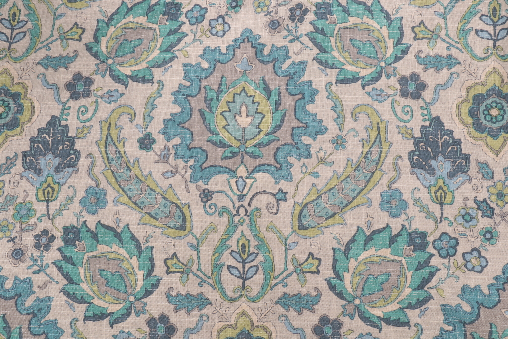2.5 Yards Covington Bursa Printed Linen Blend Drapery Fabric in Aquamarine Details