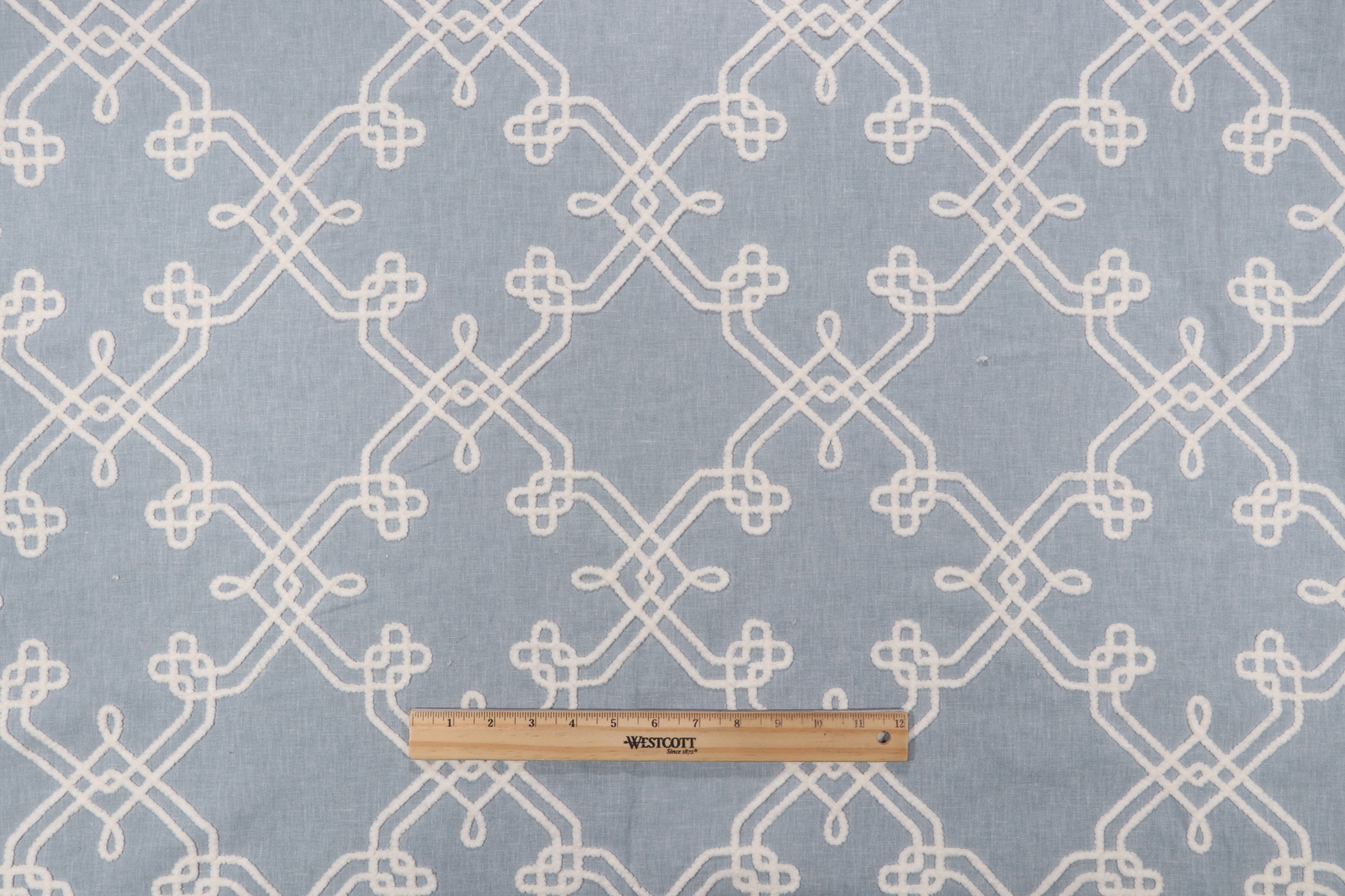 PK Lifestyles Dynasty Embroidered Drapery Fabric in Chambray is a remnant. Fabric remnants refer to leftover pieces of fabric from production runs at manufacturing sites or pieces that remain from by the yard stock. The lengths of these remnants can vary from a few inches to several yards and are typically sold at a reduced price, since they represent remaining inventory.