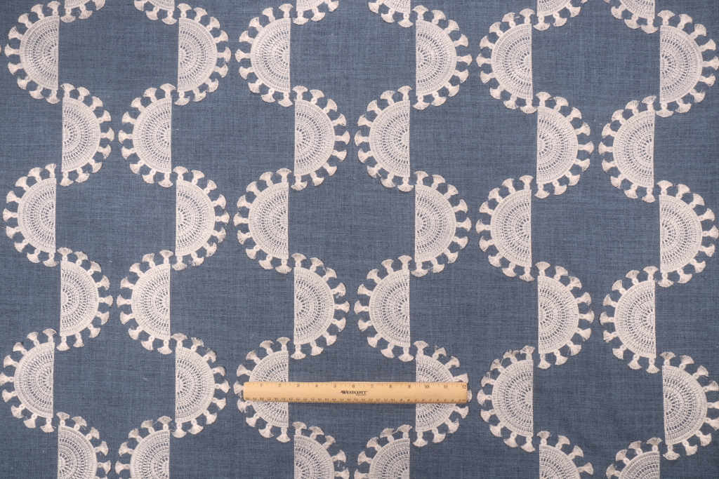 PK Lifestyles Solara Emb Woven Embroidered Drapery Fabric in Tide is a remnant. Fabric remnants refer to leftover pieces of fabric from production runs at manufacturing sites or pieces that remain from by the yard stock. The lengths of these remnants can vary from a few inches to several yards and are typically sold at a reduced price, since they represent remaining inventory.