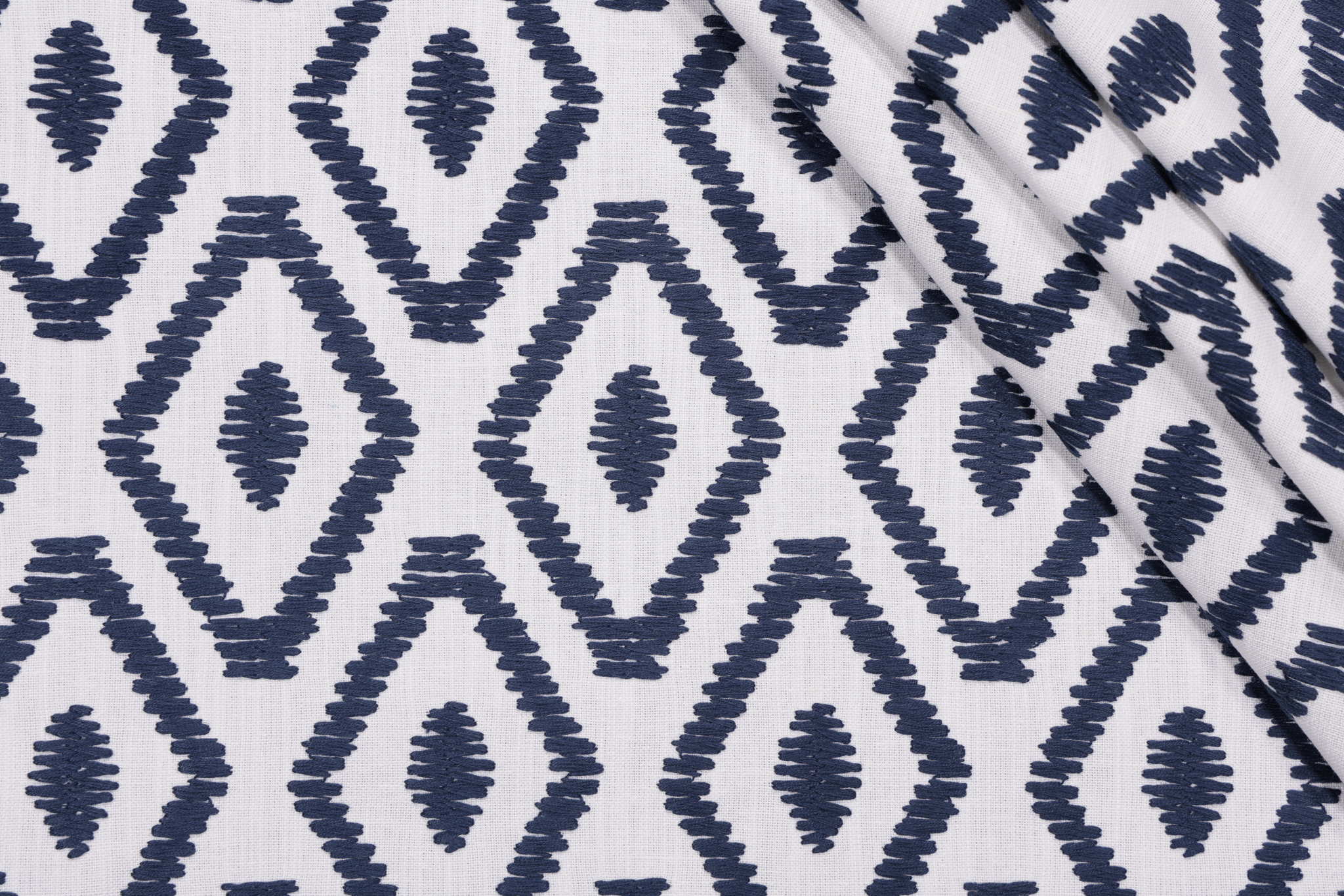 Valiant Fabrics Canyon Embroidered Drapery Fabric in Navy is a remnant, which is sold as a whole piece.