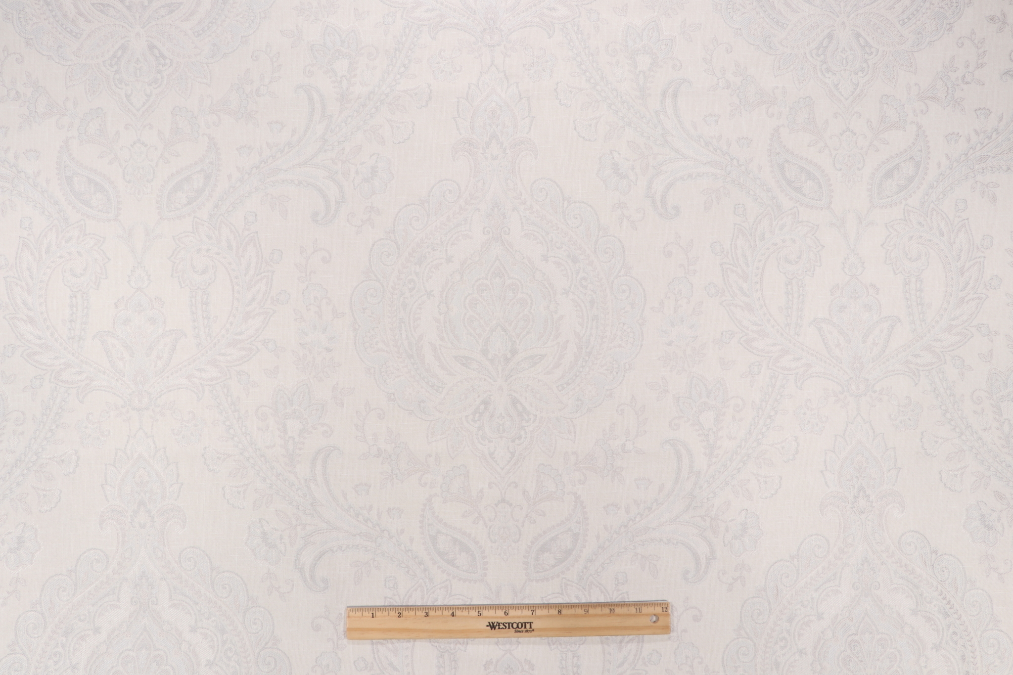 Isadora Damask Decorator Fabric in Dove is a remnant, which is sold as a whole piece.