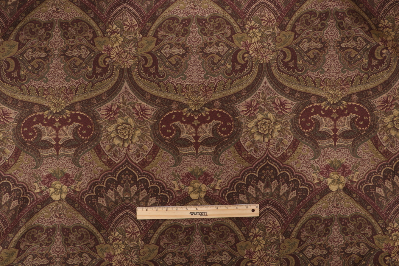 Scalamandre Rodas Tapestry Upholstery Fabric in Vert/Burgundy is a remnant. Fabric remnants refer to leftover pieces of fabric from production runs at manufacturing sites or pieces that remain from by the yard stock. The lengths of these remnants can vary from a few inches to several yards and are typically sold at a reduced price, since they represent remaining inventory.