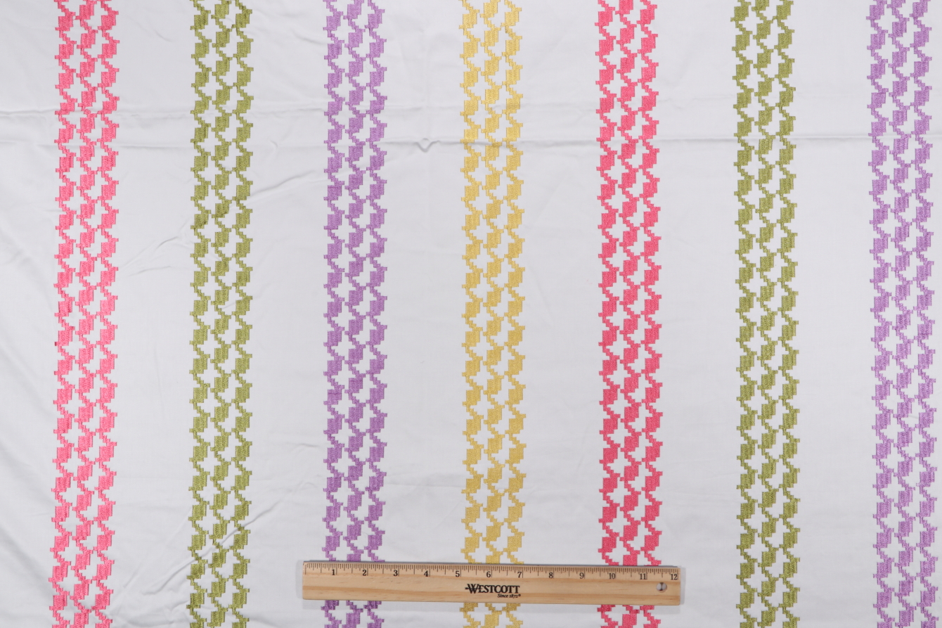 Aldeco Graceline Embroidered Drapery Fabric in Colorfulness for Scalamandre is a remnant. Fabric remnants refer to leftover pieces of fabric from production runs at manufacturing sites or pieces that remain from by the yard stock. The lengths of these remnants can vary from a few inches to several yards and are typically sold at a reduced price, since they represent remaining inventory.