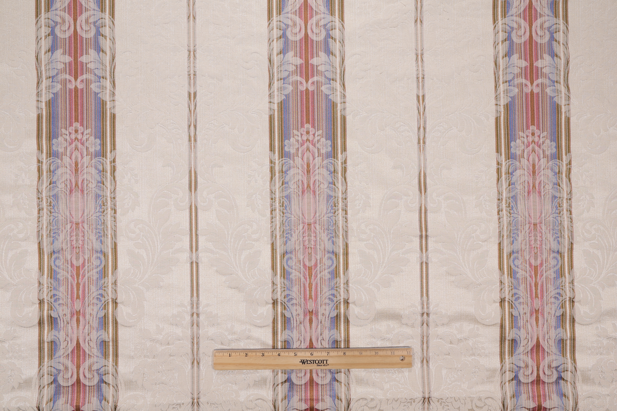 If you order a sample of Isabel Stripe Damask Decorator Fabric in Multi/Ivory the size of the swatch you receive will be approximately 4" x 6". This is enough fabric to verify color and texture, but may not be large enough to capture an entire pattern.