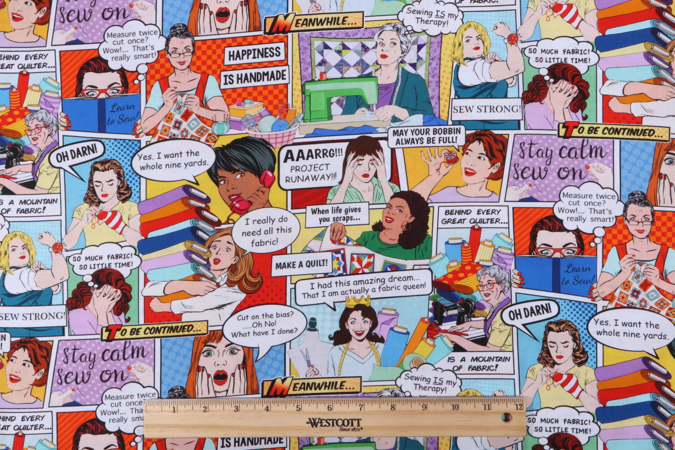Please allow 2-3 business days for your Timeless Treasures Sewing Room - Sewing Comic Printed Cotton Craft Fabric in Multi sample to ship via USPS Priority mail.